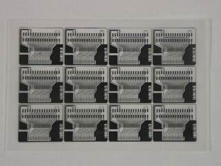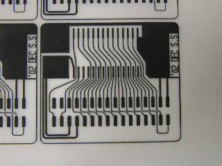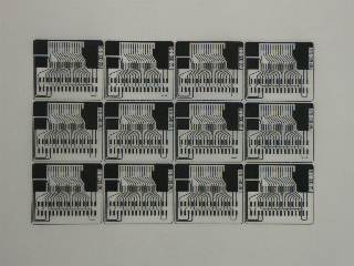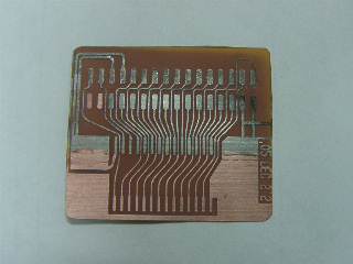 | まずSRAMを載せるパターンを市販カメレオンフレキで自作しました。 アートワークはJW_CADで書いて、 レーザープロッタでトレーシングペーパーに鏡反転で打ち出し、 百均のホトスタンドのガラスで印字面と感光面を合わせ太陽光で露光しました。 (フレキは同時に12枚作成しています) |