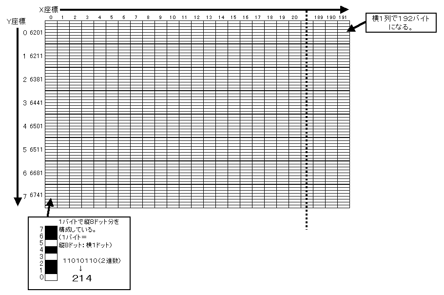 縦8ドットで1バイトを構成しています(つまり、1バイトで縦8ドット:横1バイトを表現出来ます)。